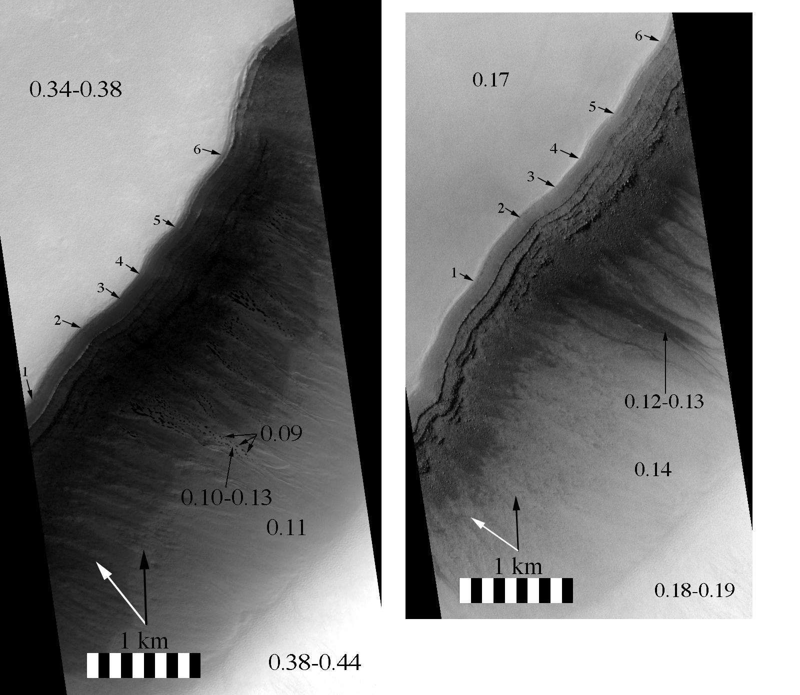 Figure 1: Seasonal changes seen in gullies. Left) Portion of MOC image M03-07645 showing dark spots within gully channels at Ls = 185 (early spring).; Right) Portion of MOC image M09-02965 showing the same gullies as on left, but at Ls = 243 (late spring). Both images are in sinusoidal projection. Shown are scale bar, north azimuth (large black arrow), azimuth to Sun (white arrow), and tie points to image at right (numbered arrows). Number ranges are relative albedos derived from MOC radiometric calibration and TES albedo "normalization."
