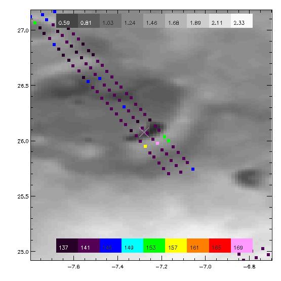 Figure 2: TES footprints overlaid on MOLA topography near the pit seen in MOC images M03-07645 and M09-02965 (Figure 1). The "X" is the center of the MOC image. Scale is 25 µm brightness temperature. The data here is at the same time as image M03-07645 in the early spring. The temperatures are below 145-146 K, the CO2 sublimation temperature at this elevation, indicating that CO2 frost or ice is abundant on the surface. Using this method, developed by co-author T. Titus, we can determine TES brightness temperatures and albedos for areas near the MOC images of interest.